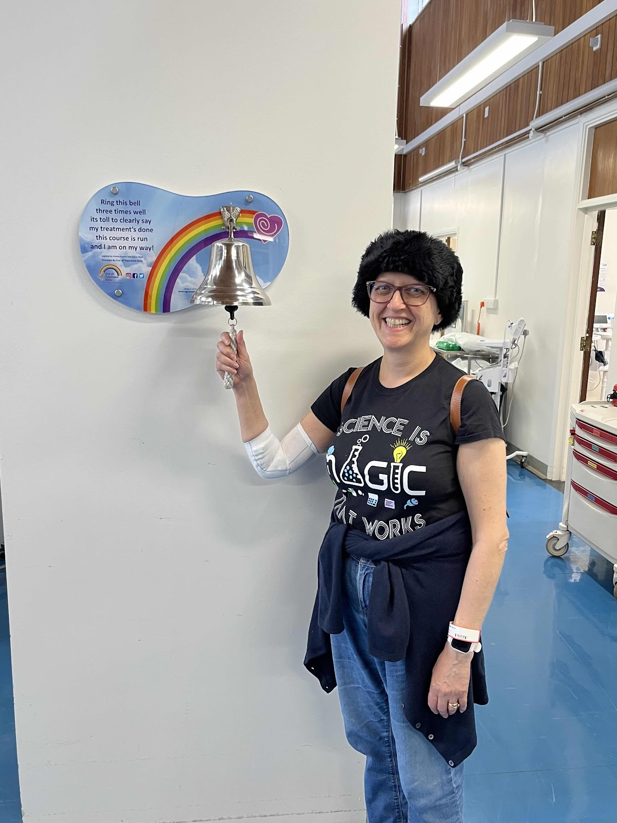 The really good news is that I had a PET scan on 8th April and except for a couple of non-reactive spots on my liver, the lymphoma was GONE! I’ve had two rounds of chemotherapy since then, so those spots should be gone by now. I even got to ring the bell to proclaim that I’d had my final round.